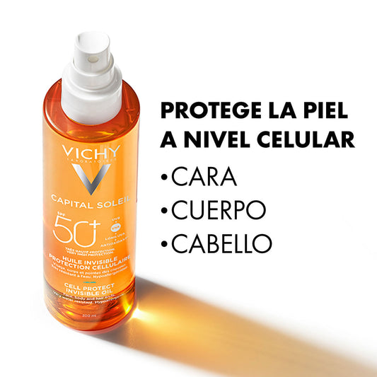 Vichy Capital Soleil Aceite Celular Protector FPS 50 Para Rostro, Cuerpo y Cabello Atomizador Con 200 ml