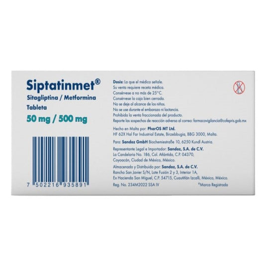 Siptatinmet Sitagliptina / Metformina 50 mg / 500 mg Caja Con 28 Tabletas