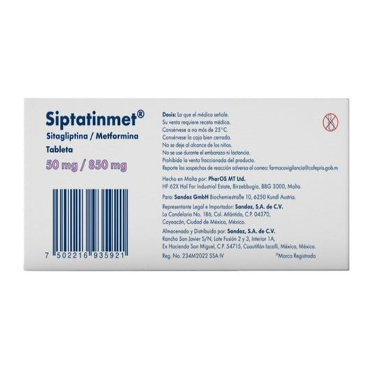 Siptatinmet Sitagliptina / Metformina 50 mg / 850 mg Caja Con 56 Tabletas