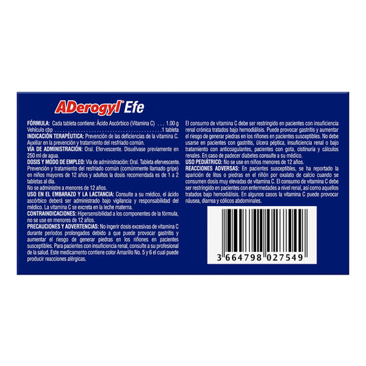 Aderogyl Efe Vitamina C Para Prevención Del Resfriado Común. 10 Tabletas De 1 G.